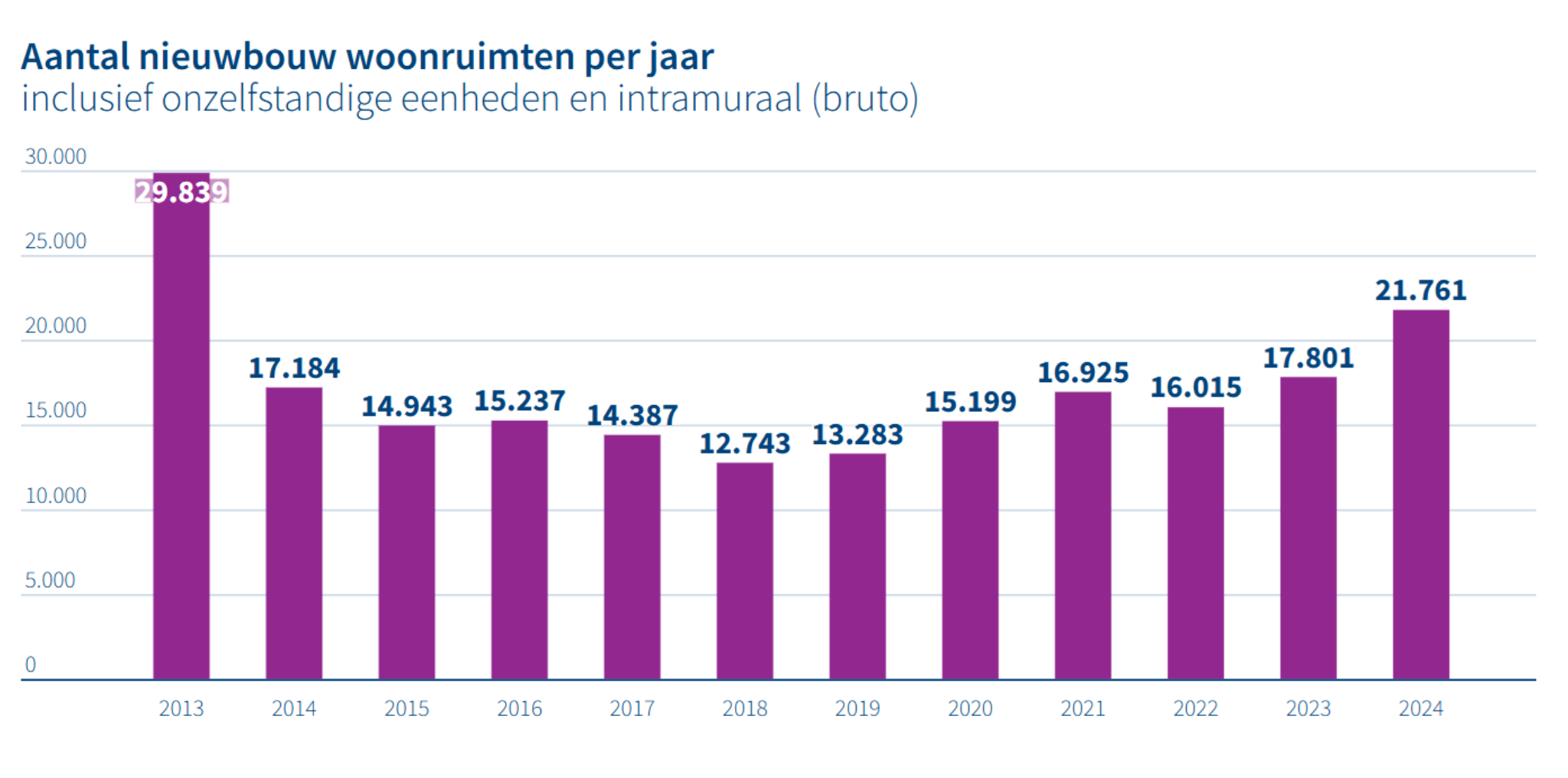 Met 21.761 nieuwe woningen in 2024 laten corporaties een flinke groei in nieuwbouw zien: in 2023 leverden ze nog 17.801 woningen op. Deze groei moet doorgaan, het doel is om in 2029 zelfs 30.000 woningen neer te zetten. In 2024 nam het aantal appartementen met 12.850 het meest toe: een groei van 19% ten opzichte van het voorgaande jaar. Maar ook het aantal eengezinswoningen en andere woningtypen laten een stijgende lijn zien.