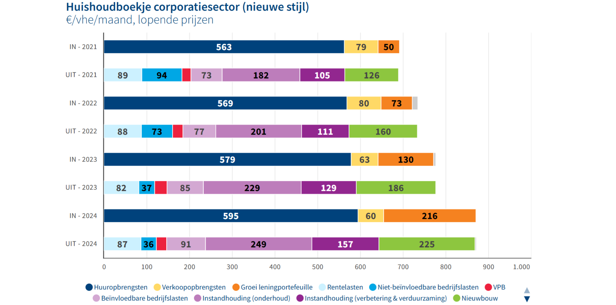De huren van hun bewoners zijn vrijwel de enige inkomstenbron van corporaties. In 2024 was de gemiddelde huur van een corporatiewoning € 611 per maand. De investeringen worden voor het vierde achtereenvolgende jaar niet volledig gedekt door de huurinkomsten. Het huishoudboekje van de corporatiesector komt per woning iedere maand gemiddeld € 48 tekort in 2024. Om alle uitgaven te kunnen betalen, zijn corporaties daardoor steeds afhankelijker van leningen. In 3 jaar tijd is het bedrag dat corporaties lenen ruim verviervoudigd: van € 50 naar € 216 per woning per maand.