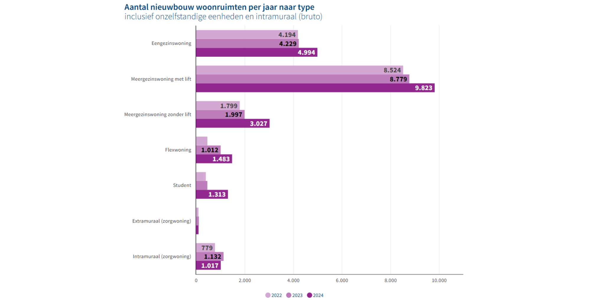 Corporaties bouwen vooral gestapelde woningen, zoals appartementen (meergezinswoningen). In 2024 werden 12.850 ‘gewone’ meergezinswoningen (met of zonder lift) via nieuwbouw of transformatie opgeleverd. Dat is 19% meer dan in 2023. Daarnaast kwamen er bijna 5.000 eengezinswoningen bij. Ook bij de andere woningtypen is een duidelijke groei van het aantal nieuwe woningen te zien.