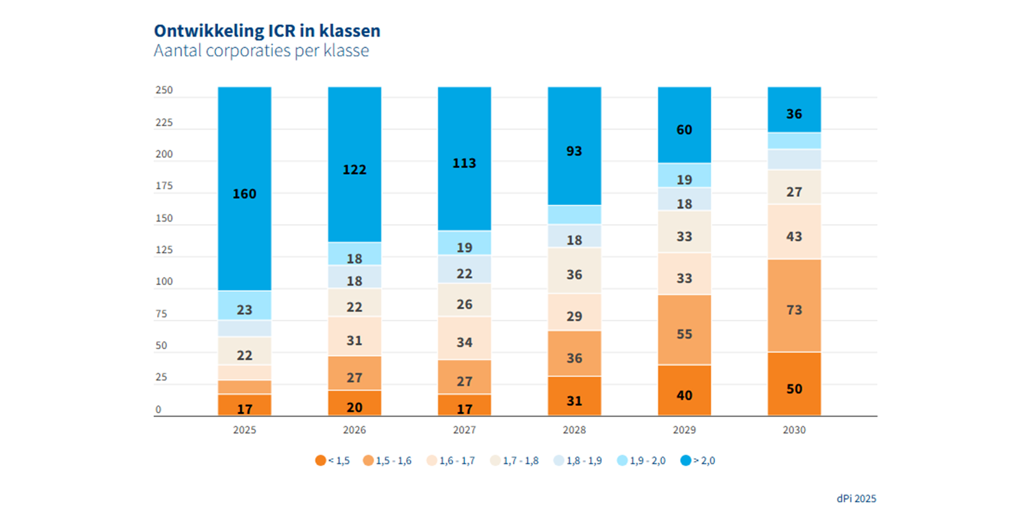De investeringscapaciteit van corporaties holt hard achteruit. Om de voorgenomen opgaven te realiseren, moeten corporaties steeds meer lenen: van € 6,9 miljard in 2025 naar € 12,2 miljard in 2027. Vorig jaar passeerde de sector al de grens van 100 miljard aan uitstaande leningen. Hierdoor neemt de gemiddelde ICR (Interest Coverage Ratio) tussen 2025 en 2030 sterk af en komt de ondergrens van 1,4 van het Waarborgfonds Sociale Woningbouw (WSW) dichtbij. Het deel van de corporaties dat vrijwel geen nieuwe leningen meer kan afsluiten (ICR onder 1,6) wordt snel groter. Zij moeten op korte termijn financieel bijsturen door investeringen te schrappen of uit te stellen.