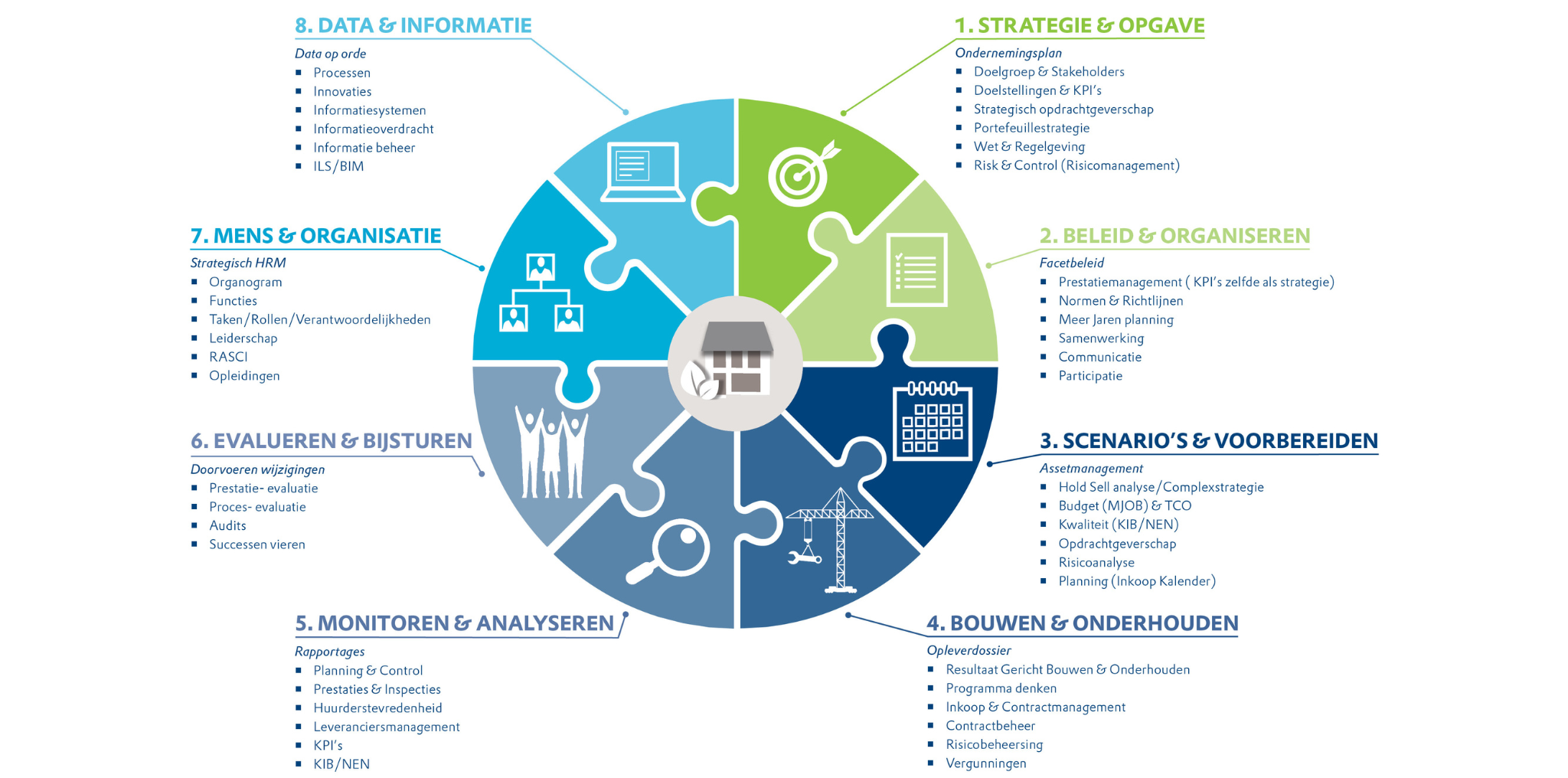 Veel onderdelen van het facetbeleid zijn een rechtstreekste uitwerking van de verschillende onderwerpen van vastgoedsturing. Met vastgoedsturing kun je borgen dat alle onderdelen van het facetbeleid op elkaar aansluiten en dus niet met elkaar conflicteren. Organiseren wil zeggen: het opstellen van een (meerjaren)programma van het bezit. De maatregelen kunnen eenmalig zijn (bijvoorbeeld nieuwbouw) of met regelmaat terugkeren (bijvoorbeeld een onderhoudsbeurt).