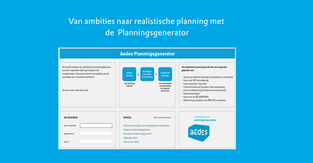 - Je kan de planningsgenerator gebruiken voor vastgoedprojecten, zowel nieuwbouw, sloop/nieuwbouw, renovatie- en verduurzamingstrajecten als transformatie. Voor VvE-projecten, (planmatig) onderhoud en aan- en verkoop is de generator niet geschikt.
