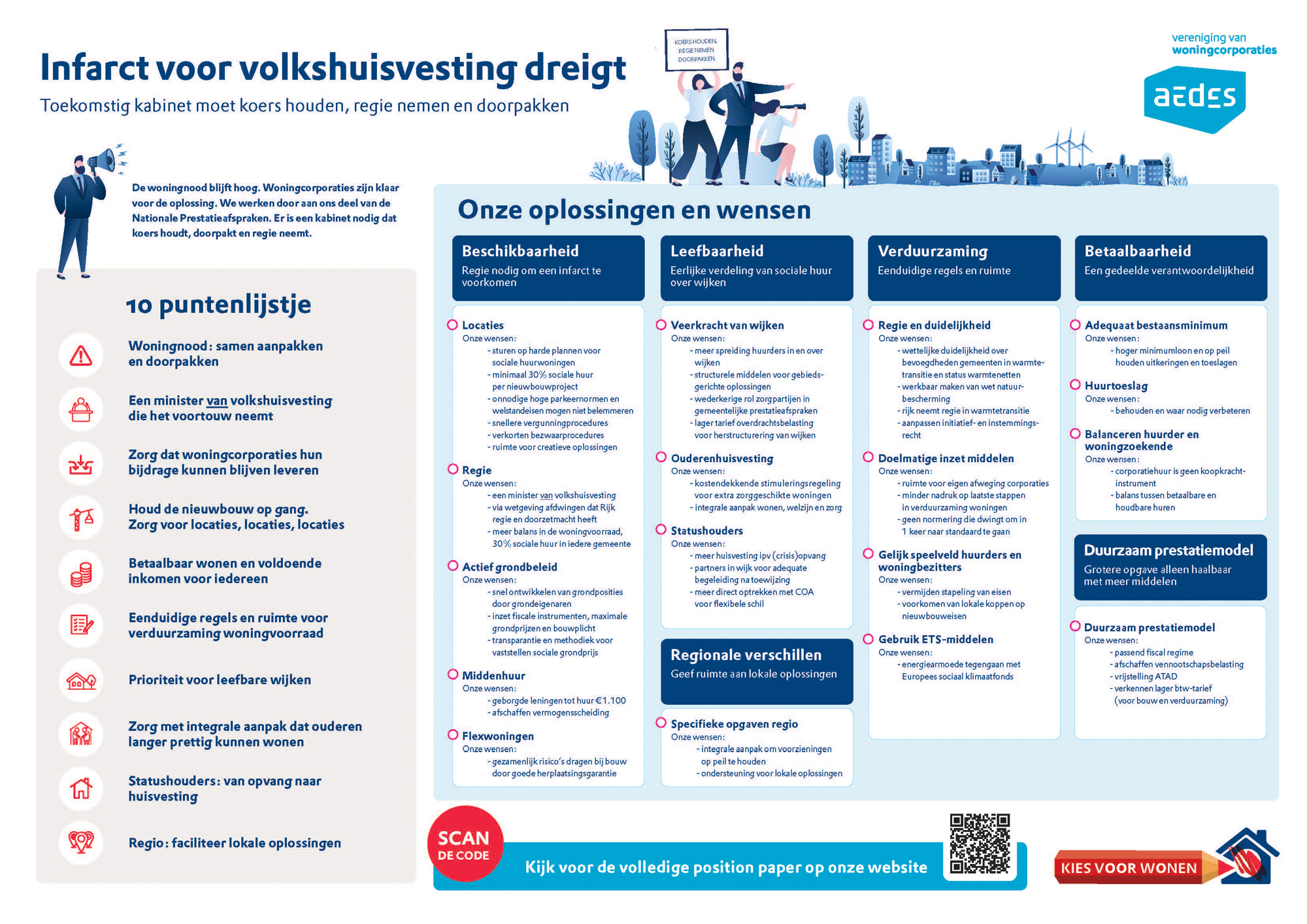 Nederland kampt met een wooncrisis en er zijn extra belemmeringen opgedoemd. Woningcorporaties doen wat ze kunnen en hebben met gemeenten en provincies regiodeals gemaakt. Het is nu tijd om plannen om te zetten in uitvoering. Daarvoor is de steun van een kabinet nodig dat koers houdt, doorpakt en regie neemt. Volkshuisvesting verdient een centrale plek in het regeerakkoord.